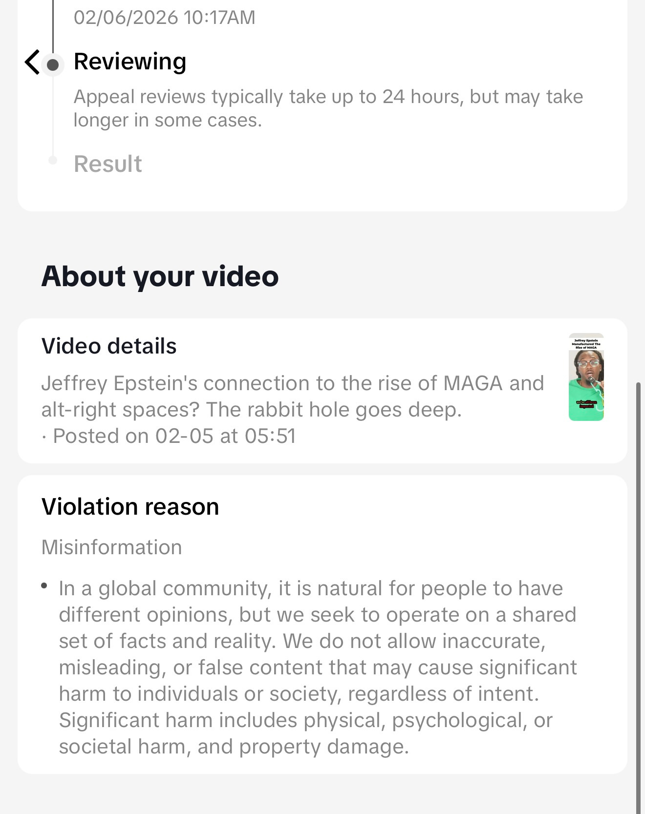 And now, after six years on this app, the pattern is clear. The suppression isn’t random; it’s targeted. I’ve received two community guideline strikes in two months—both citing “inauthenticity,” both centered on Donald Trump. First about Charlie Kirk, now about the Epstein files. My critique, it seems, is breaking the camel’s back.